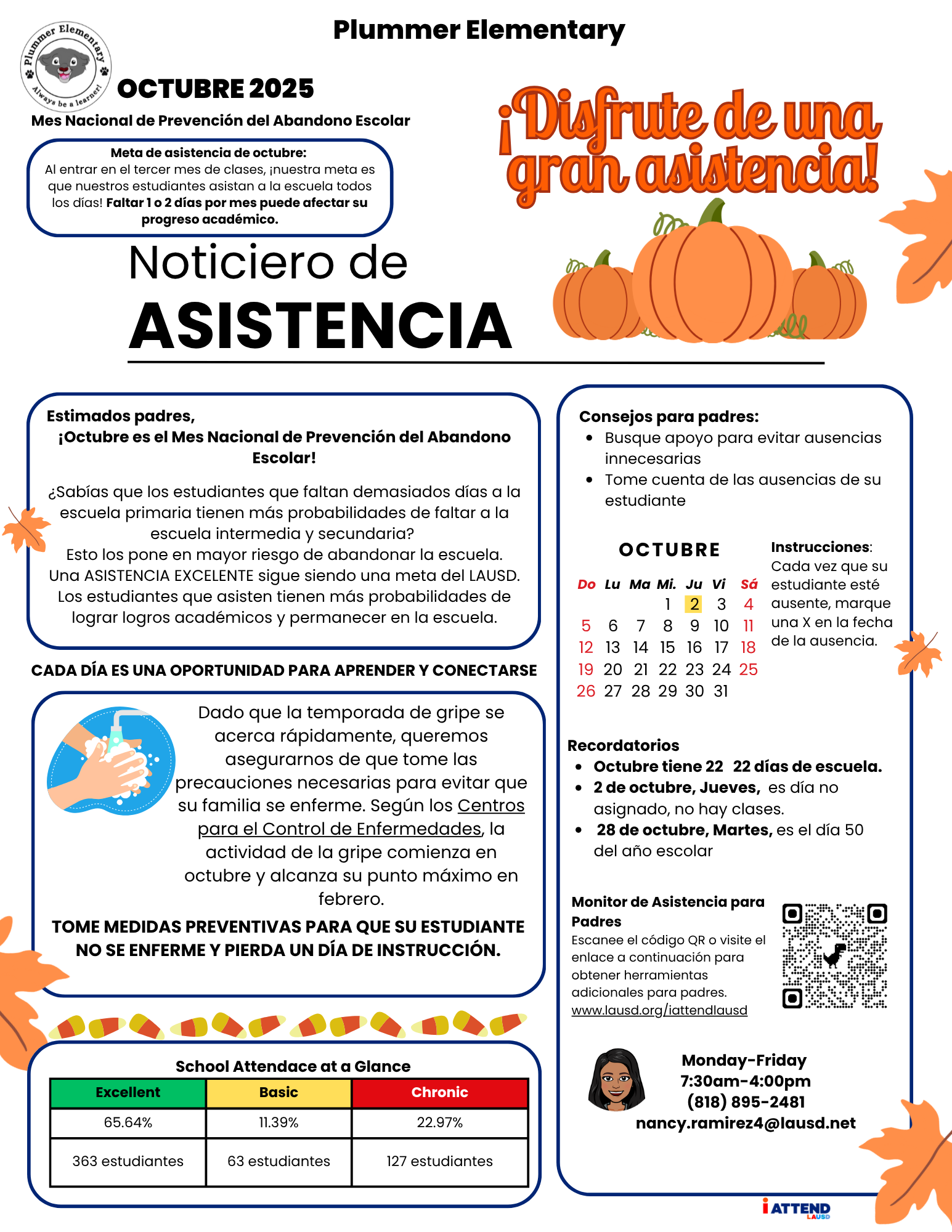 Adjunto está nuestro boletín de asistencia para octubre: eche un vistazo. ¡Los apreciamos!